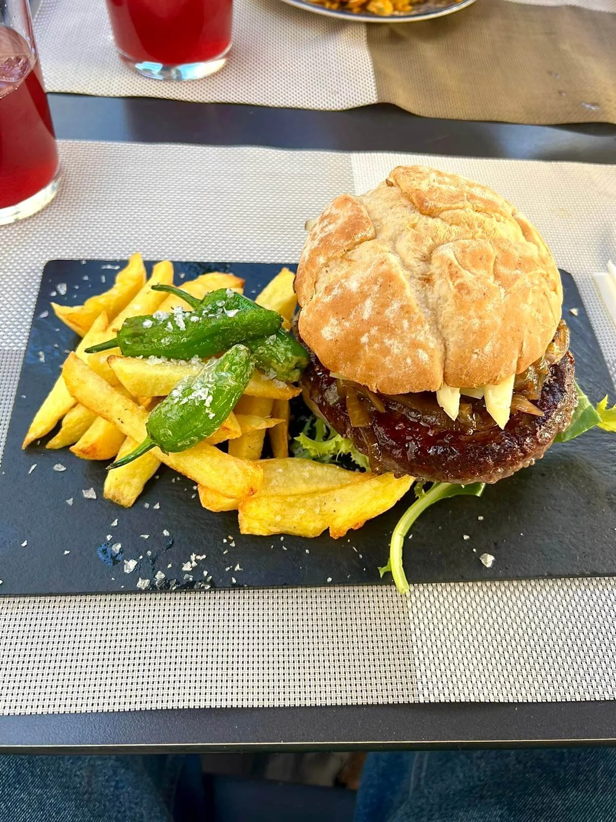 Toby indulged in a medium rare wagyu beef burger, smothered in caramelised onions, served inside a ciabatta bun with fries and padron peppers (€14.50).