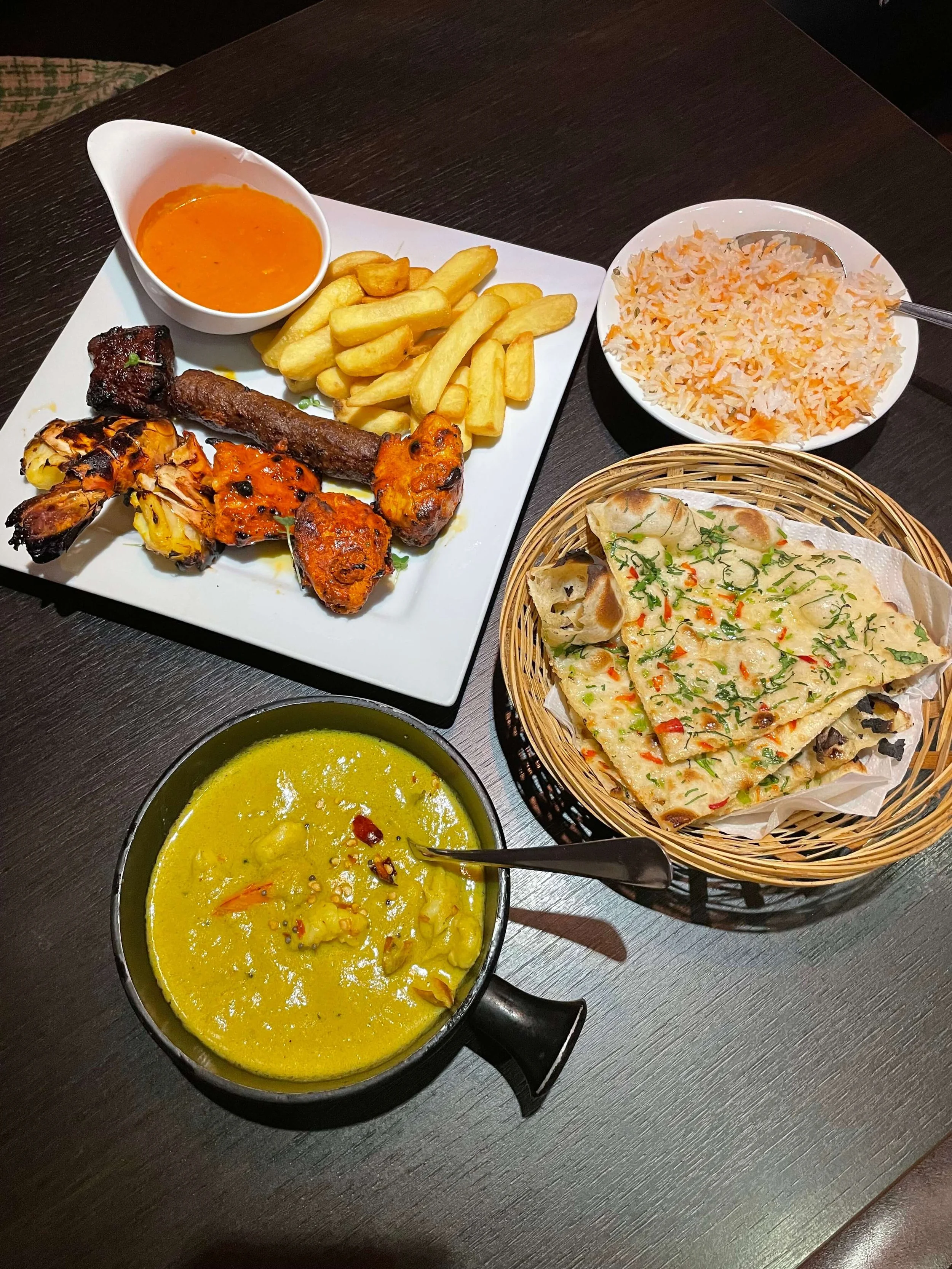 Mains arrived in the form of a Konju Manga Curry, Tandoori Surf N Turf, chilli & coriander naan bread, and pilau rice. Which, may I add, was all prettily presented.